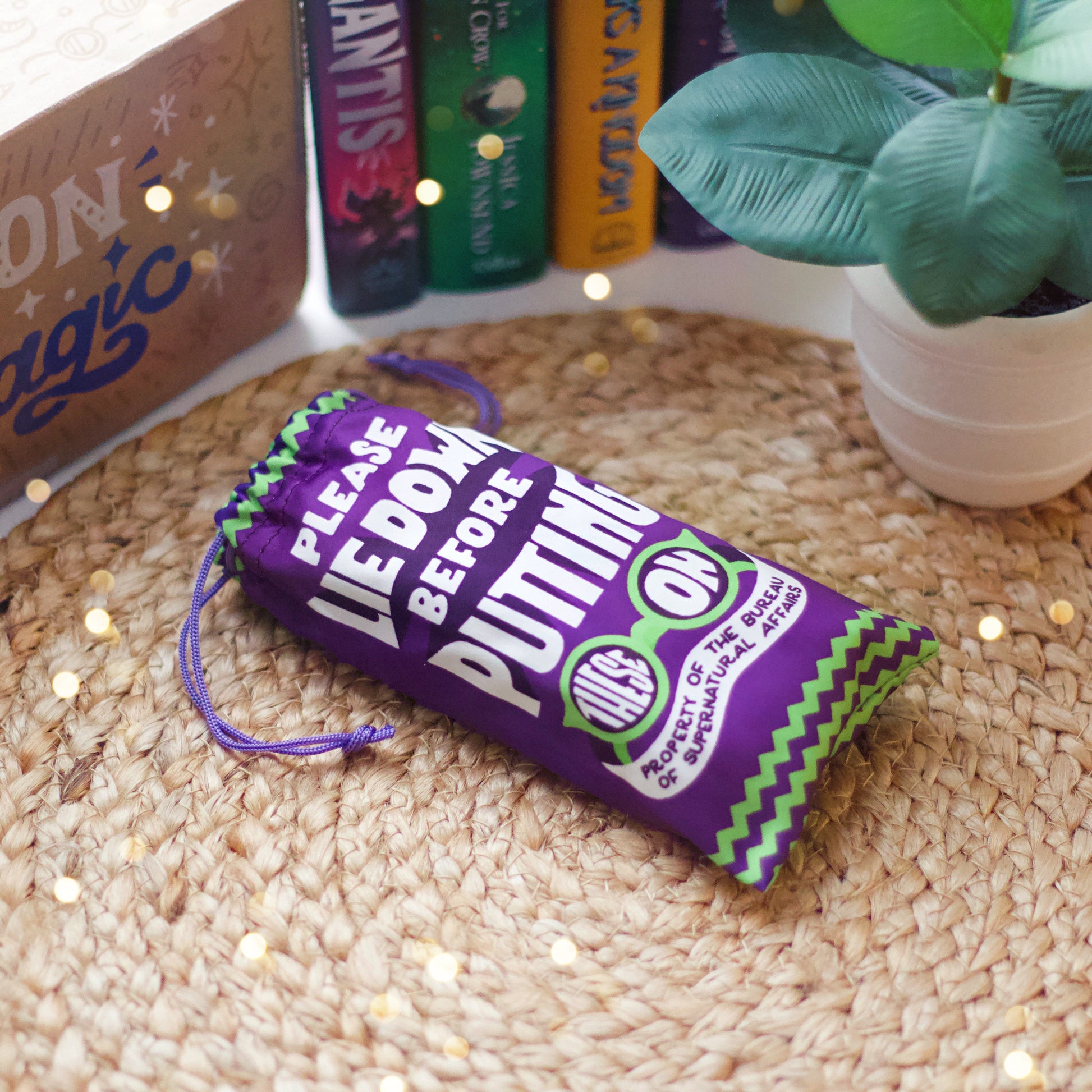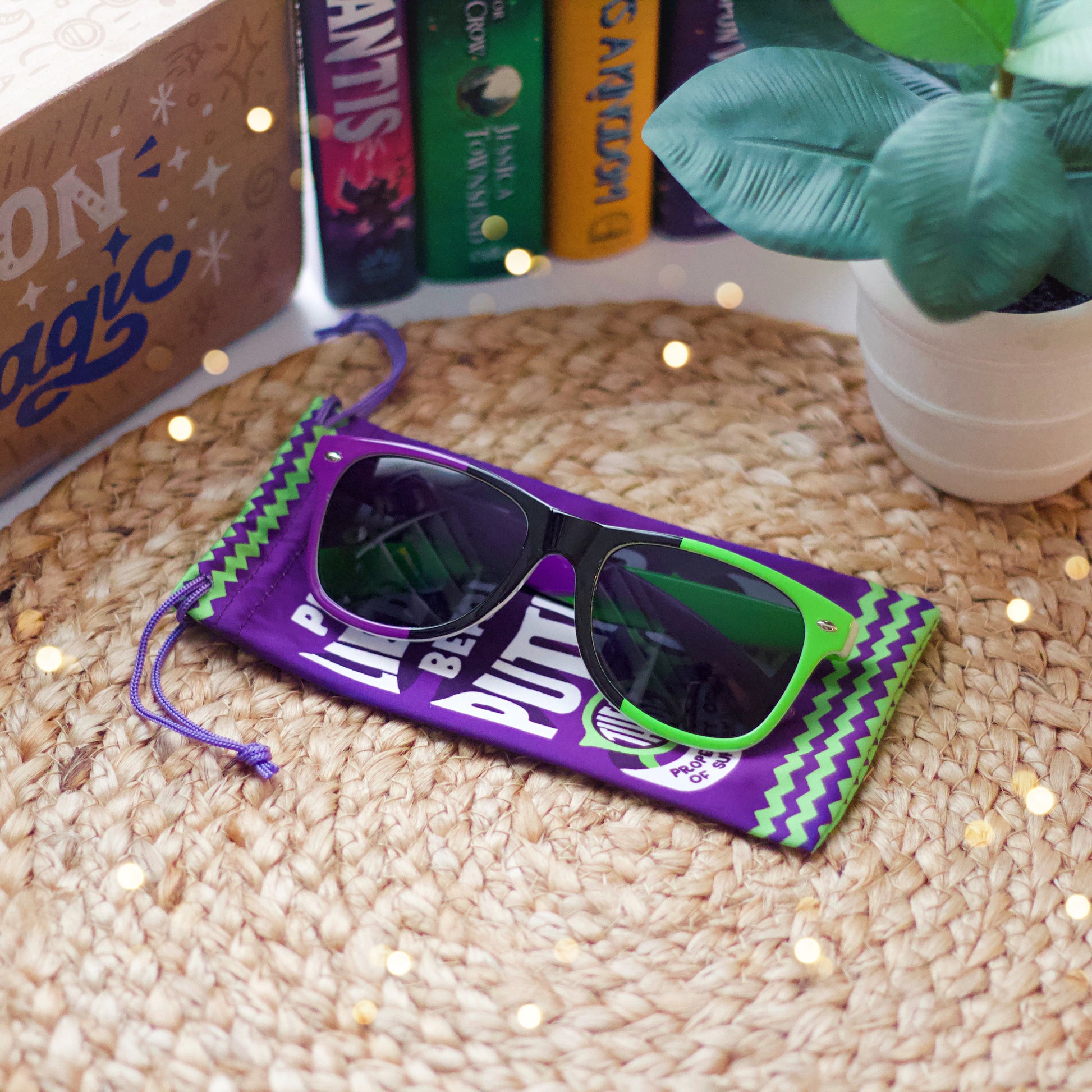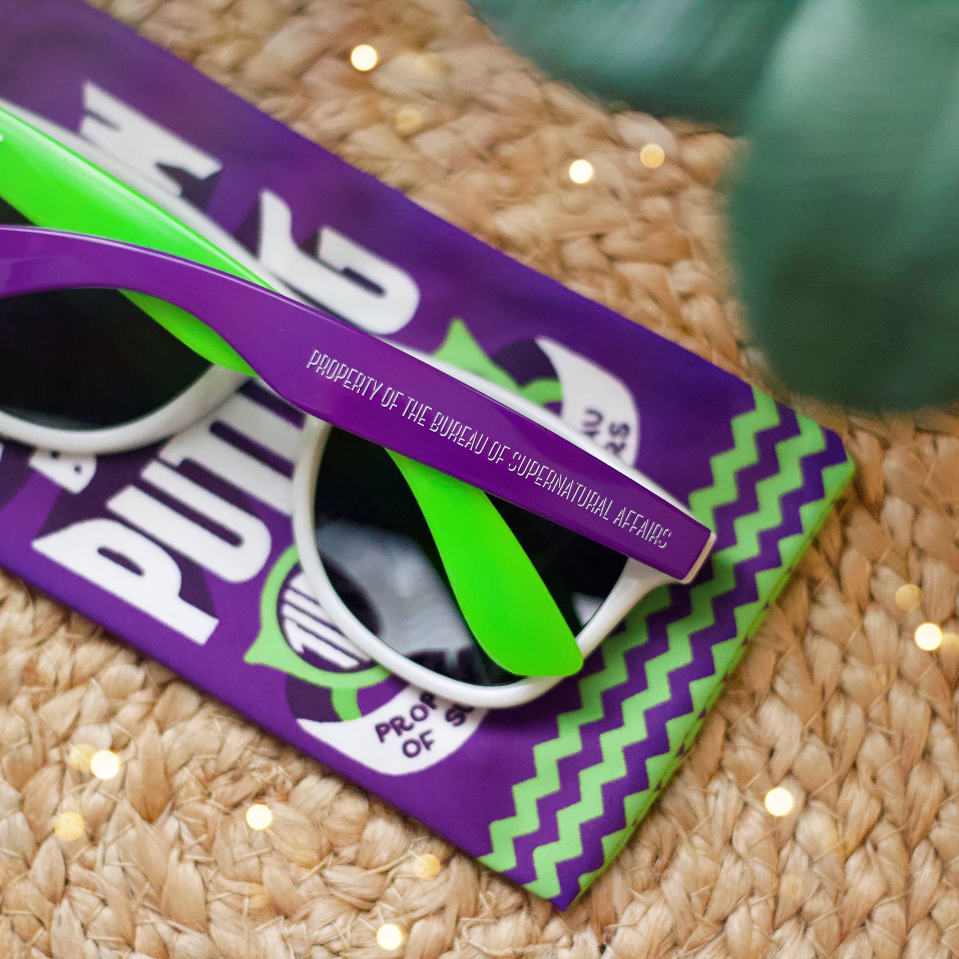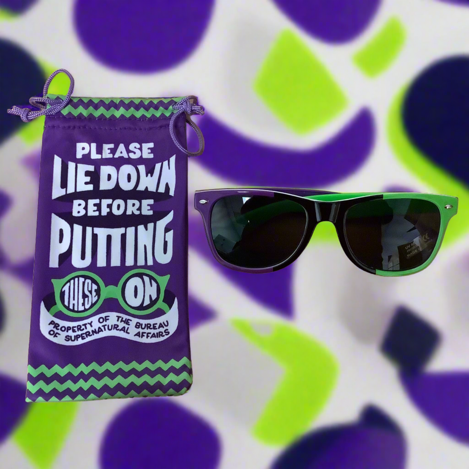 Featuring a vibrant mix of purple, green, black and white, these sunglasses are not just stylish—they're inscribed with "Property of the Bureau of Supernatural Affairs" on the side, adding an extra touch of magic. Slip them on before you visit the Bureau, and remember to follow their instructions carefully—these shades are your badge of honor in the world of the extraordinary.