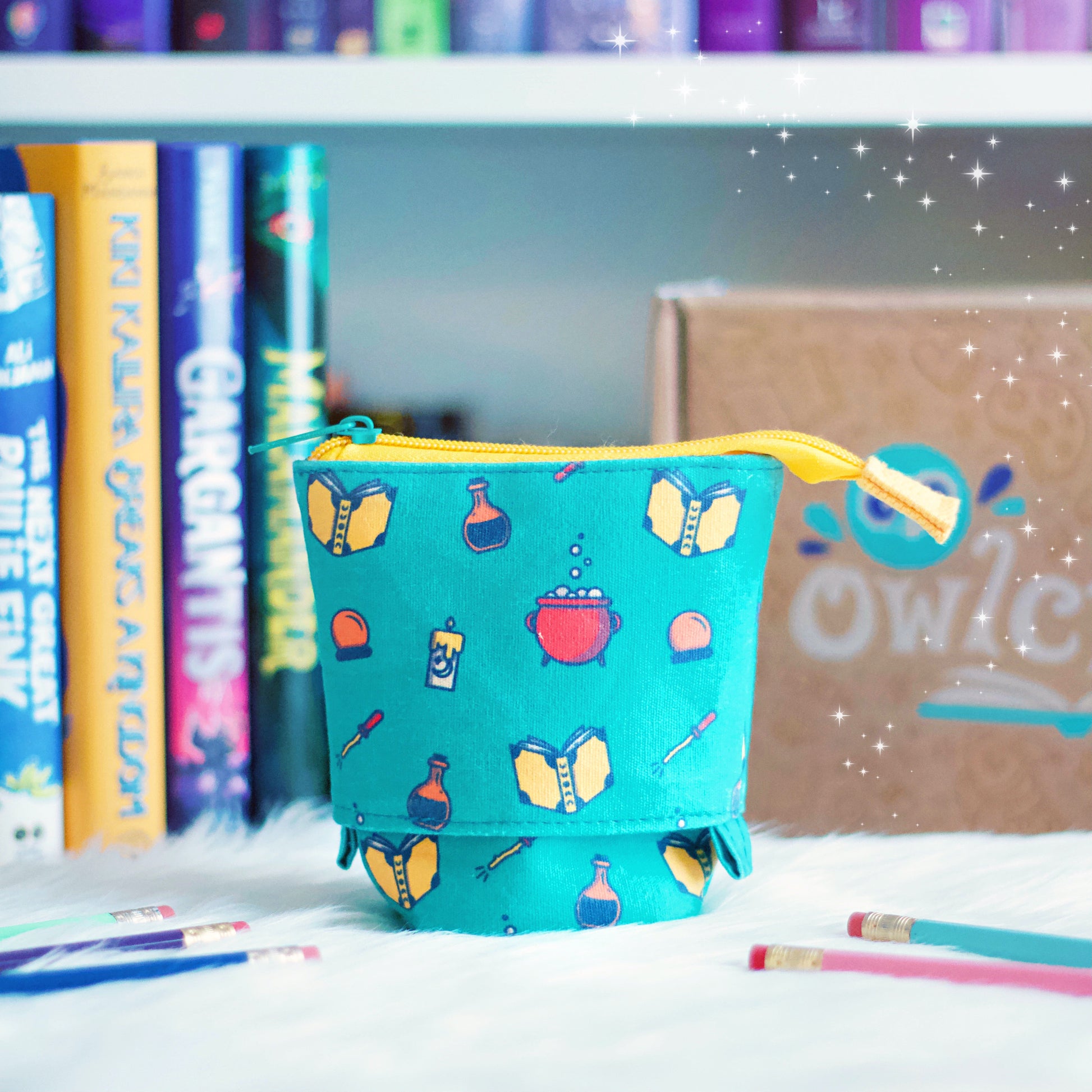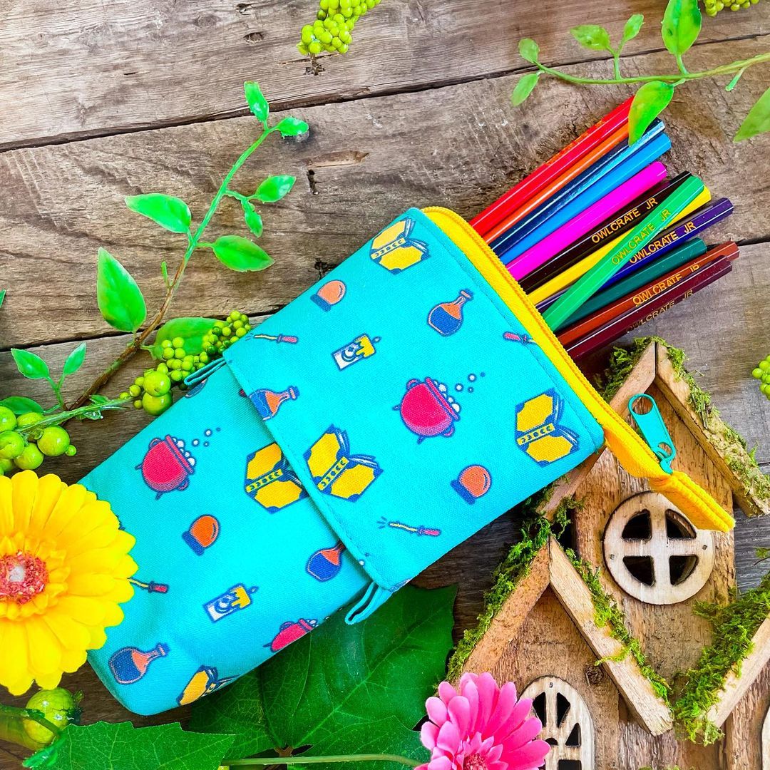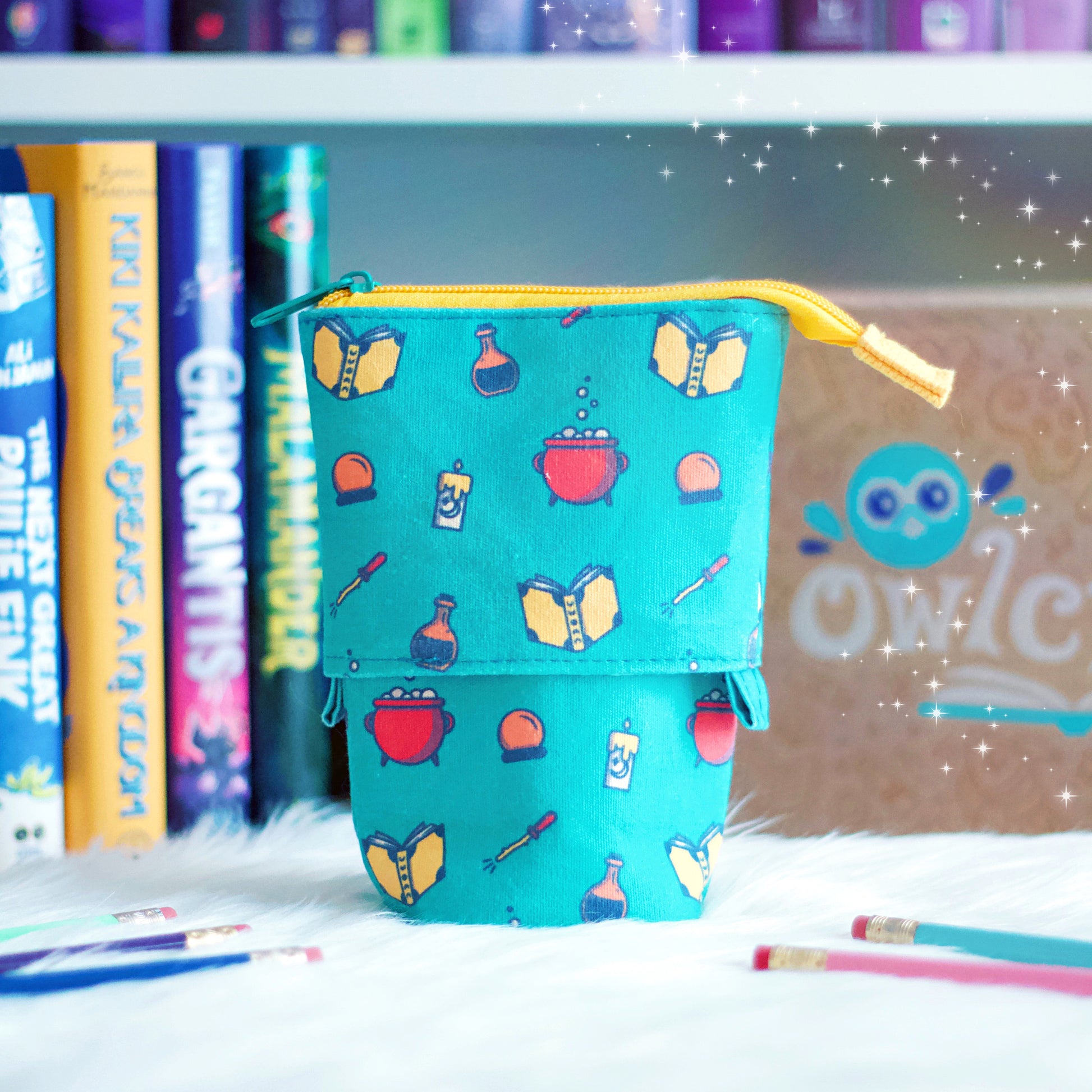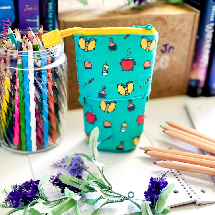 Featuring a vibrant turquoise background, a cheerful yellow zipper, and charming icons of books, candles, potions, wands, cauldrons, and crystal balls, this pencil case is as magical as it looks. The real magic? It actually pops up! Adjust the size to fit your needs or simply wow your friends with your spellbinding, size-changing pencil pouch.