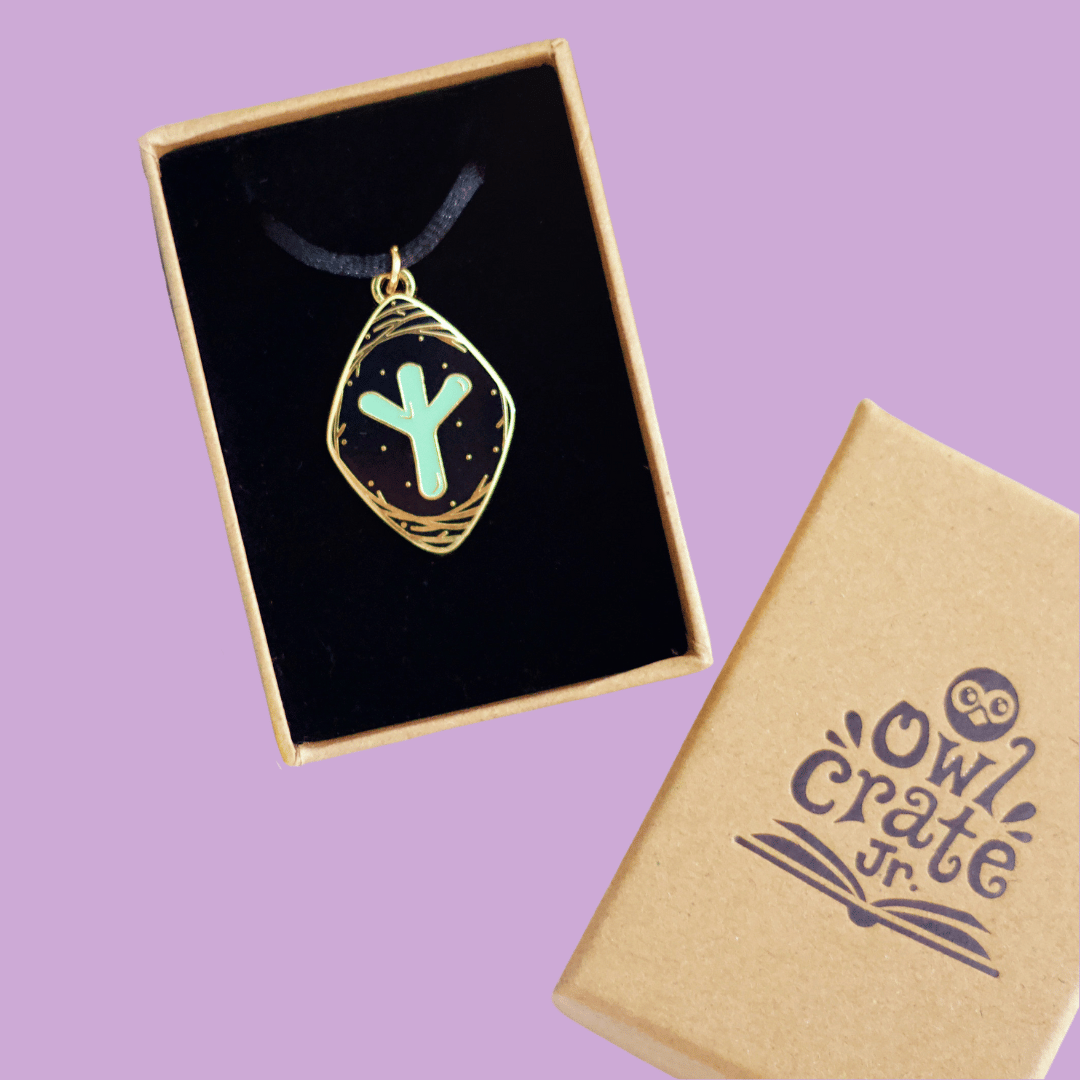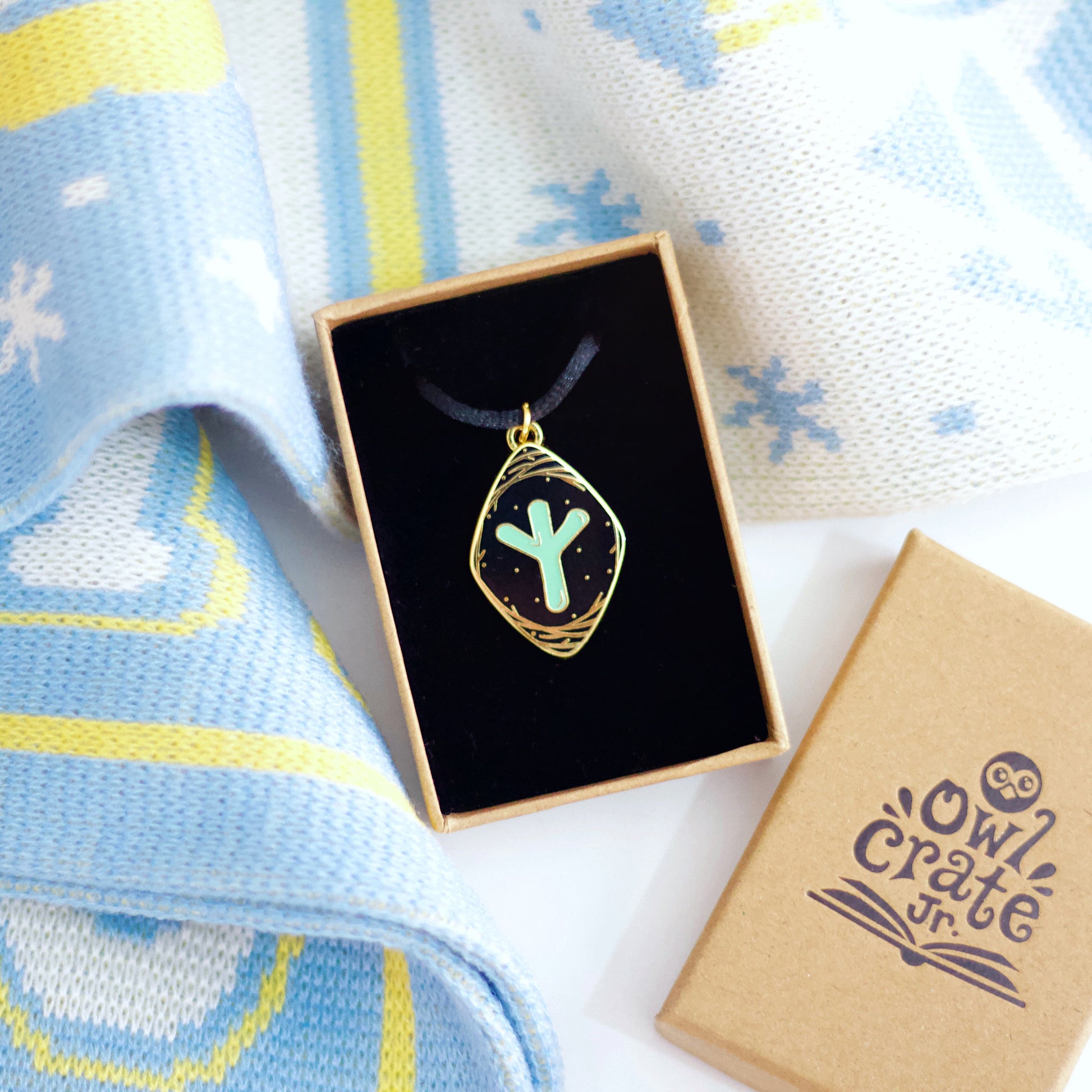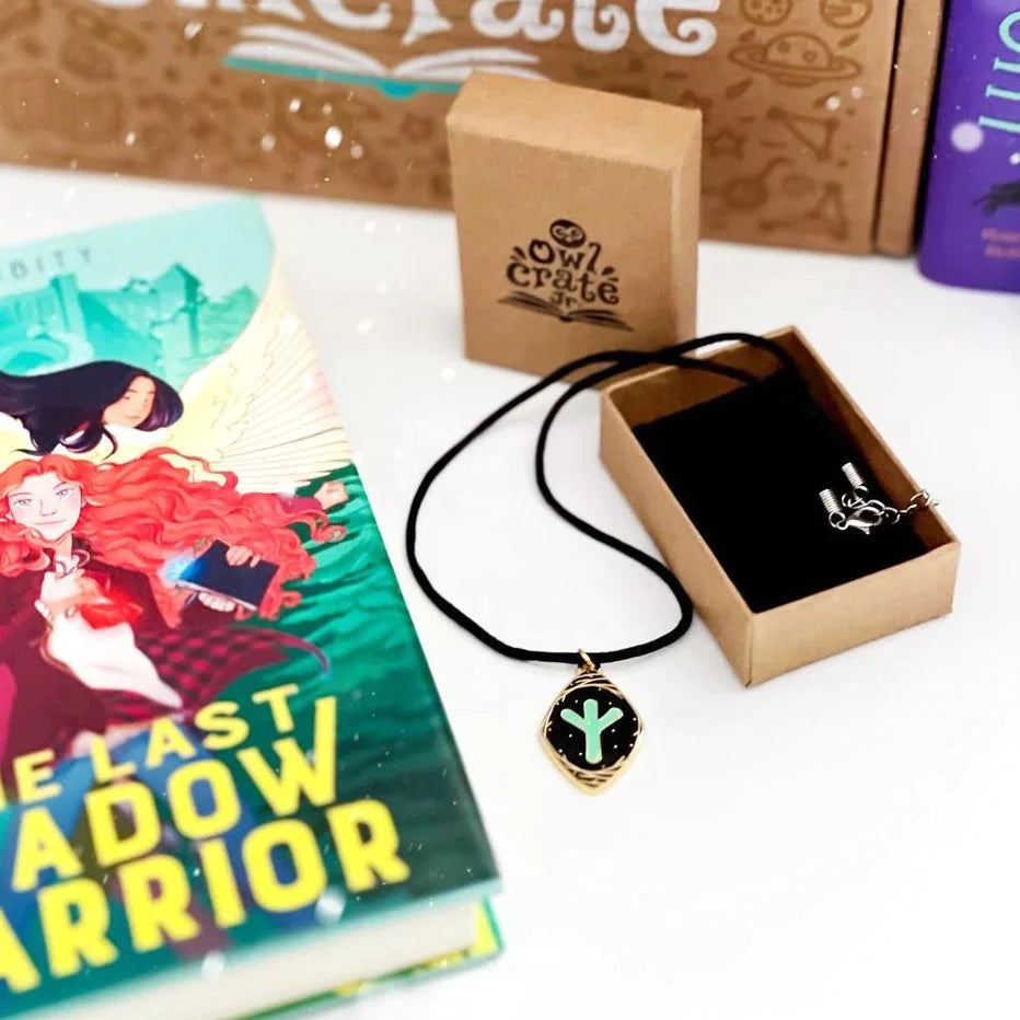 This glow-in-the-dark enamel pendant with an owl footprint was inspired by the protective runestone Abby's mom gave her in The Last Shadow Warrior. Designed by That's Lovely Dear Shop.