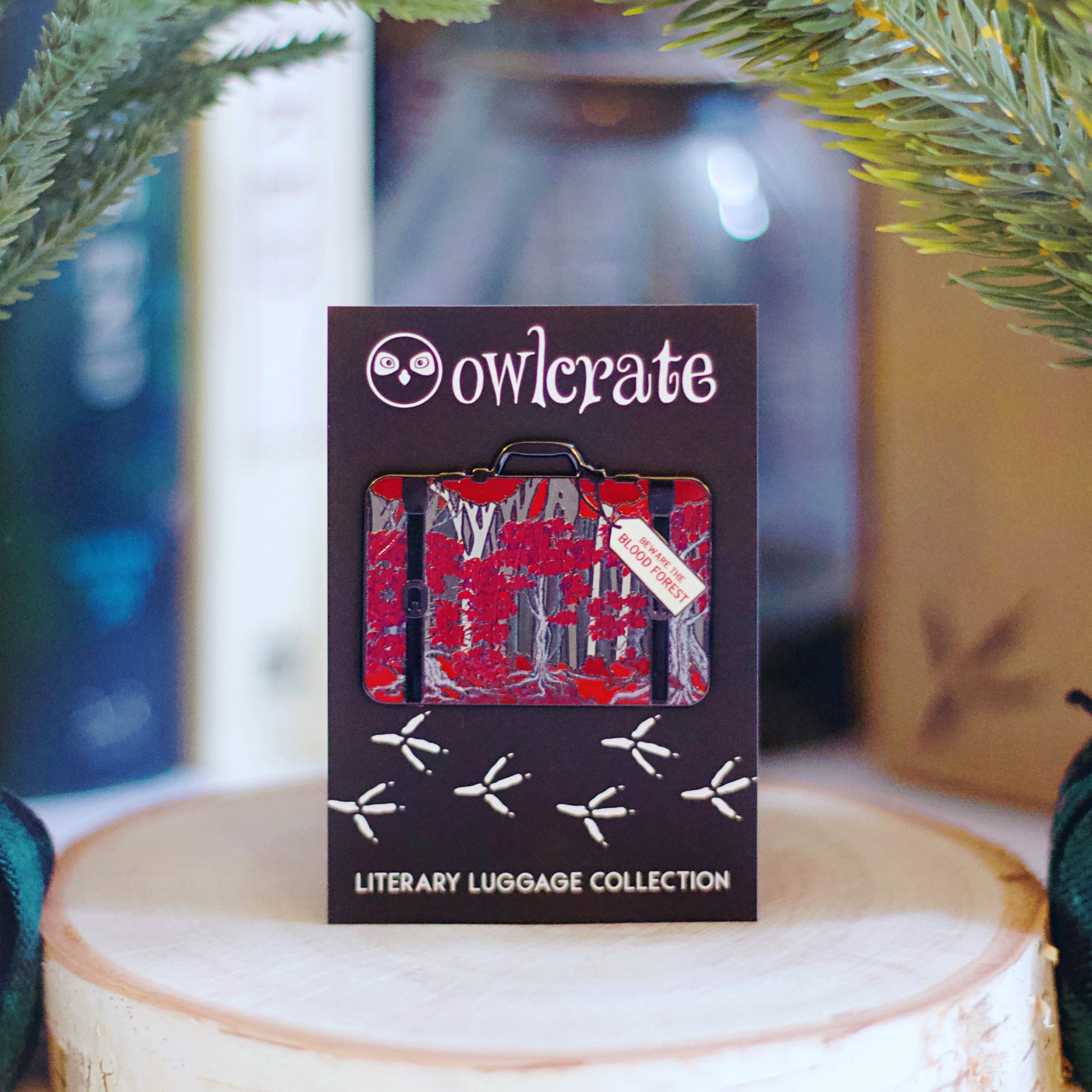 The November 2022 collectible Literary Luggage Enamel Pin, designed by artist Hey Atlas Creative, features an eerily enchanting design inspired by From Blood and Ash. The Blood Forest might look hauntingly beautiful, but beware…