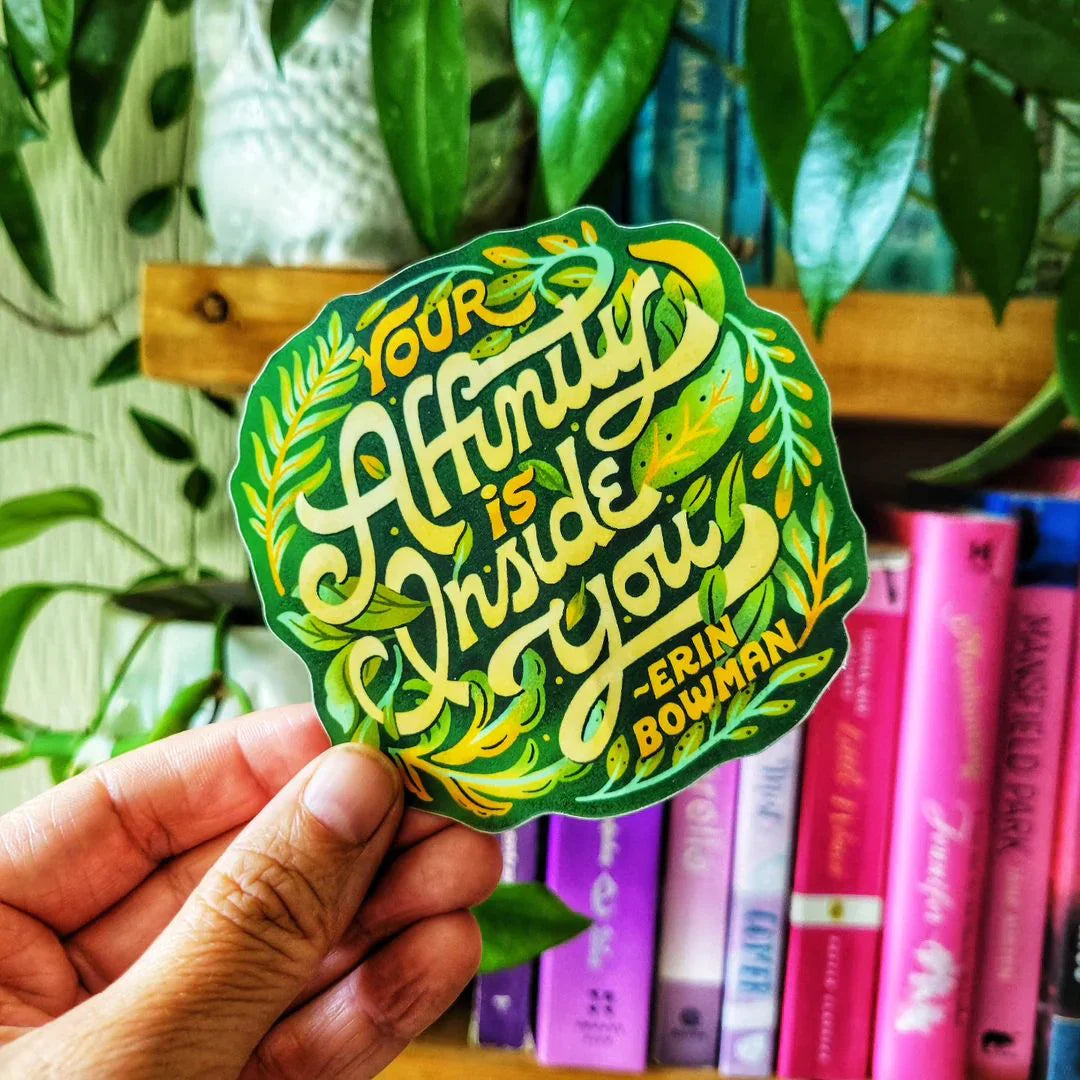 Sticker quote says: Your affinity is inside you. -Erin Bowman