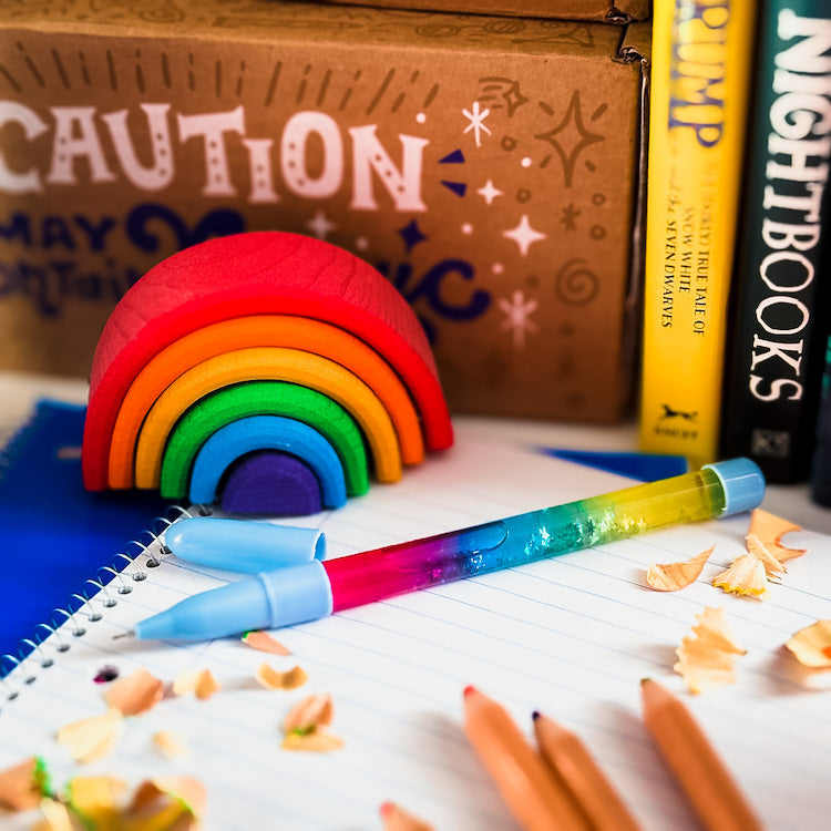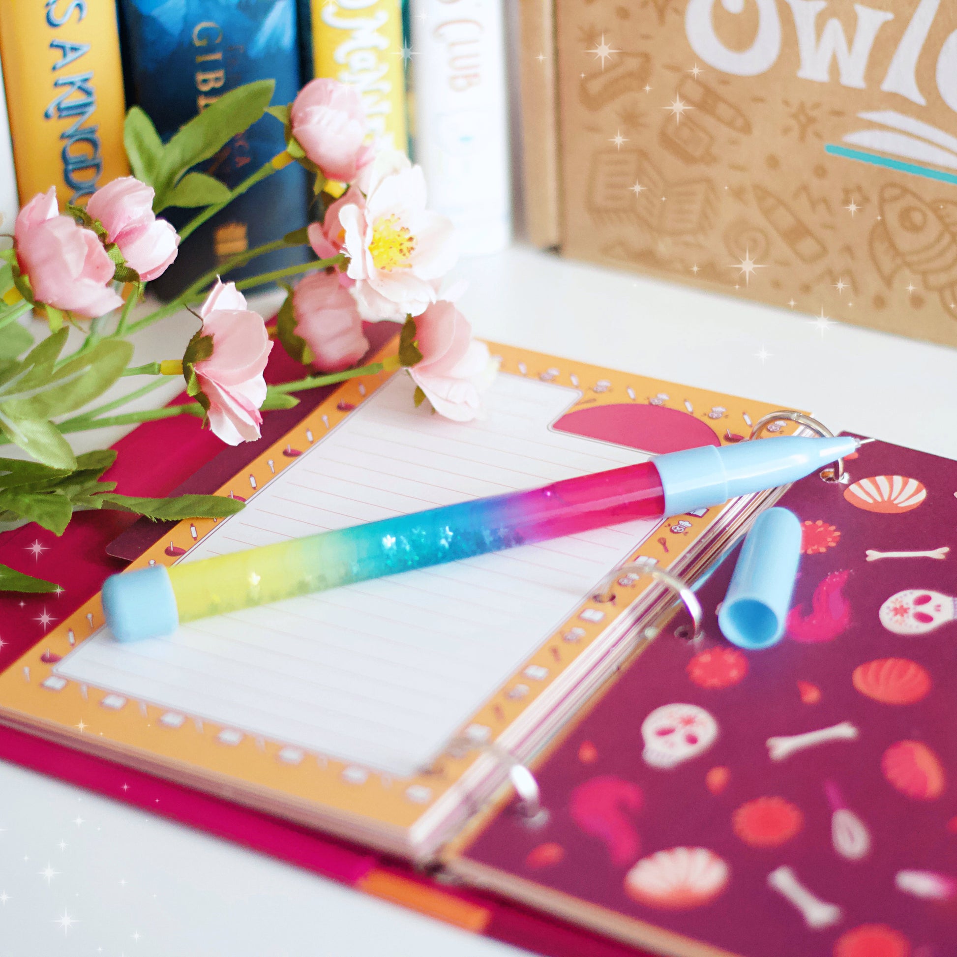 Practice your spelling and your spell-casting with the enchanting Glittery Rainbow Wand Pen from OwlCrate Jr. This magical pen is bursting with vibrant colors and shimmering glitter, making every word you write sparkle with creativity.